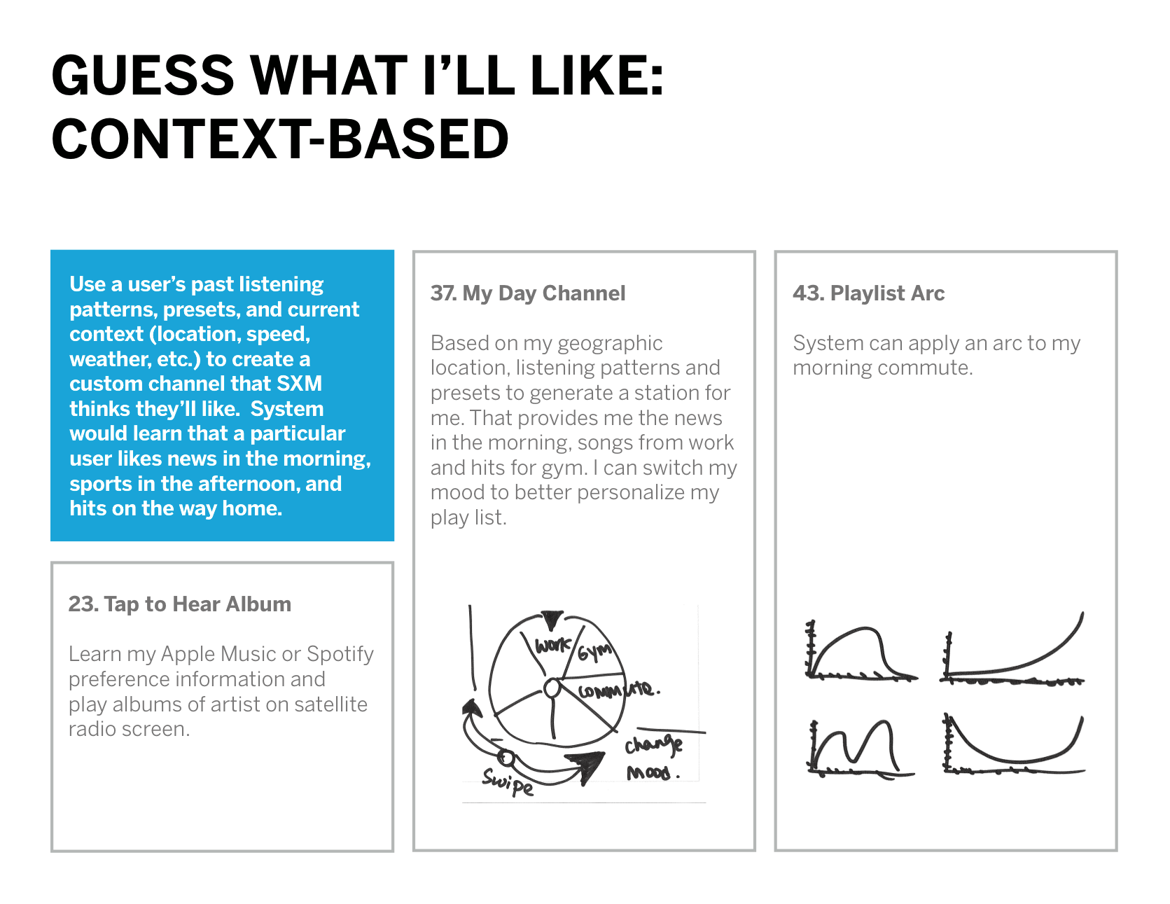 Once we had a large volume of ideas we were able to find patterns and likeness between them. We build these up and developed write-ups that would better articulate a clear concept. Once this was done we had the same group prioritize the concepts they felt would provide the greatest value and listening experience to the customers.
