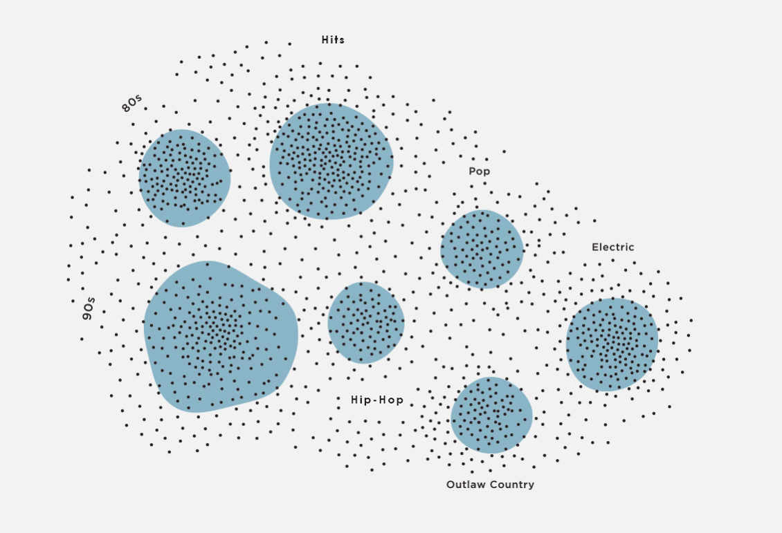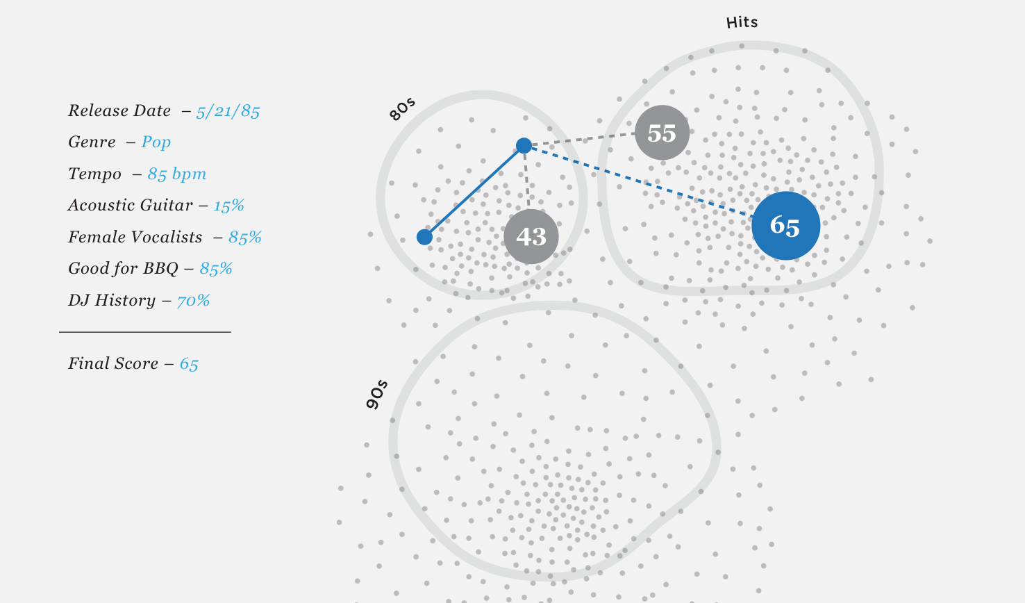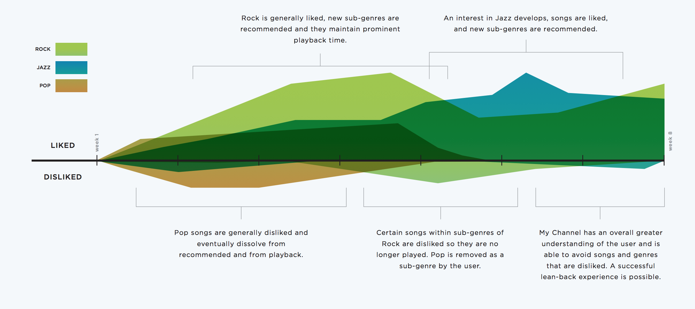 This models the landscape of song, genre and channel clusters. We need to better understand how a listening experience can traverse multiple genres and decades without having startling moments and sharp transitions. The business problem was that we couldn't allow users to stay on IP based custom channels (unique to user, many-to-many) as it costs the company about 1 dollar per song, opposed to satellite-based experiences (same for everyone, one-to-many) as they cost the company about 1 penny per song. Our challenge was to assure a seamless experience whether on a user-created channel(IP), or a SXM program channel(satelitte).